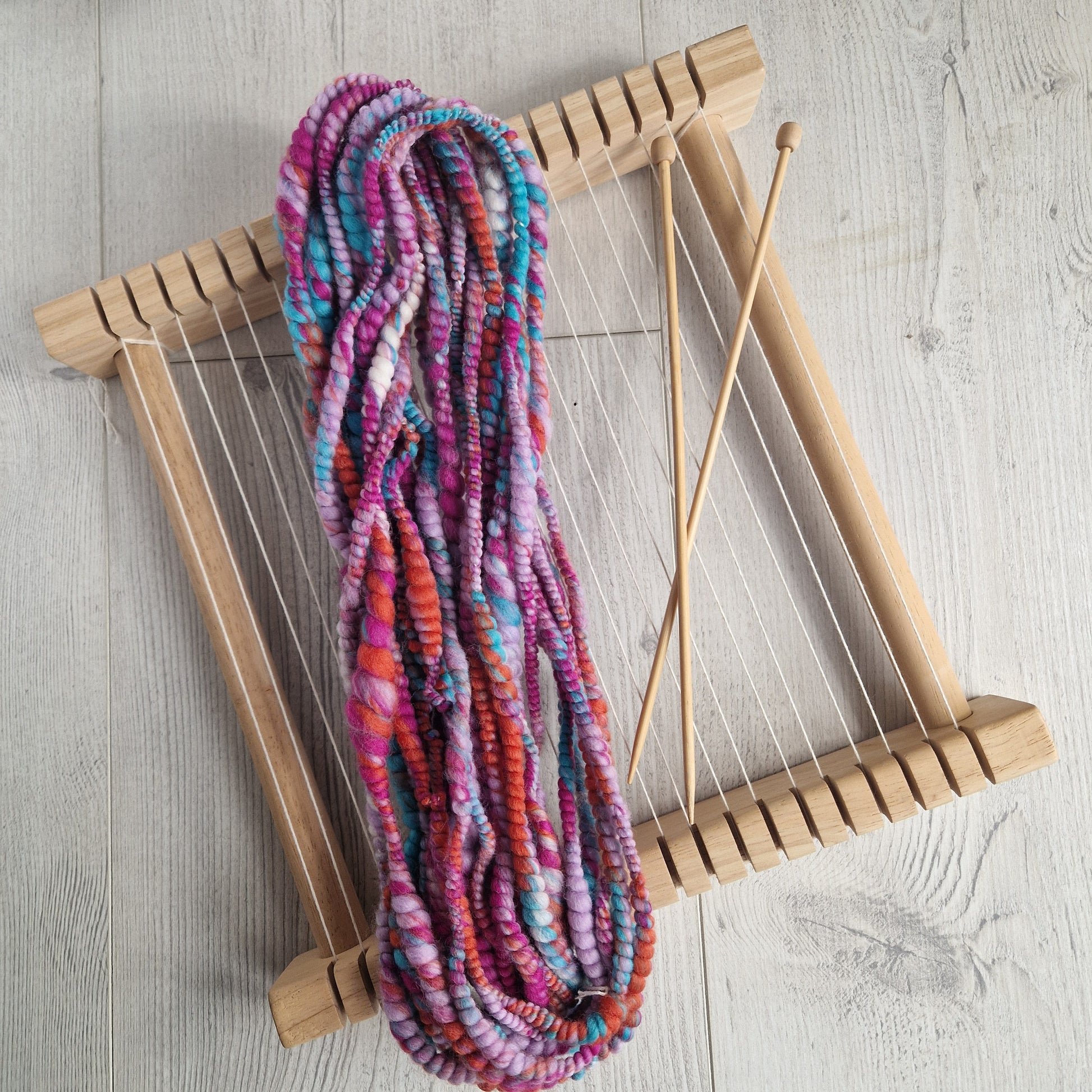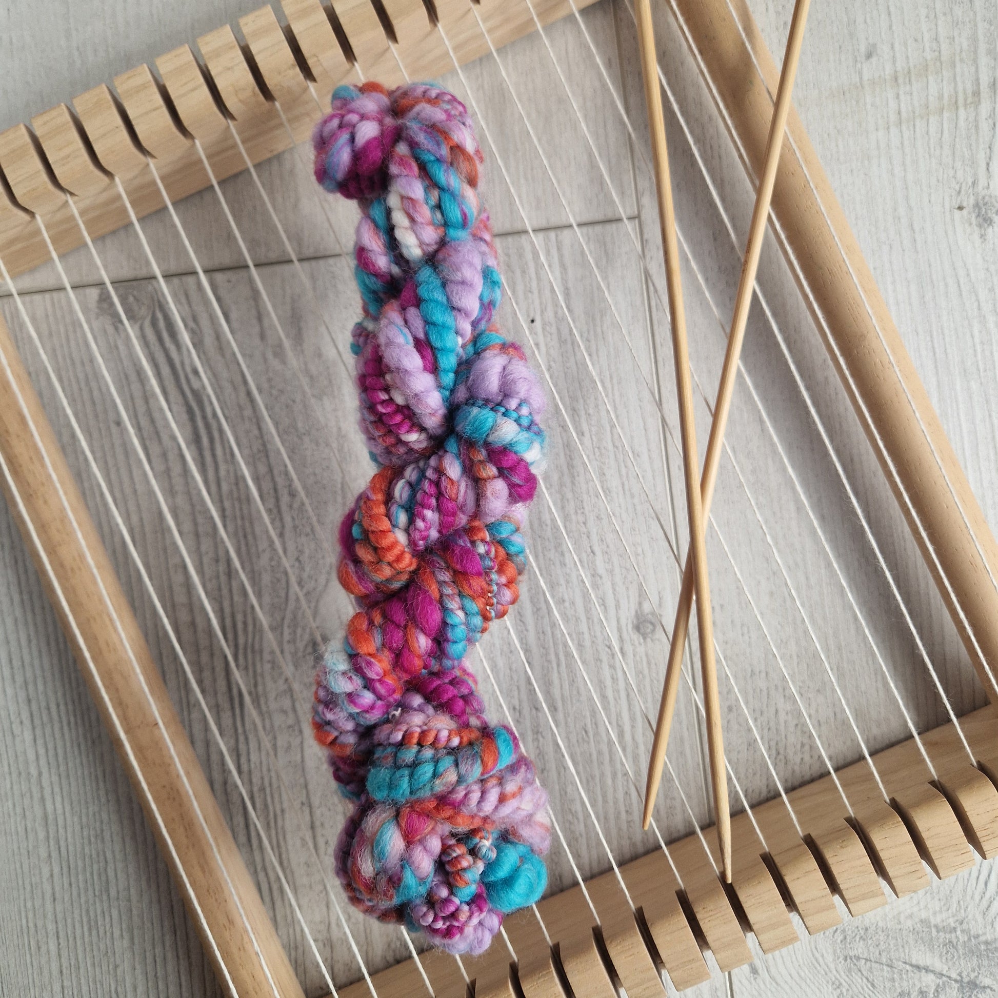 A coil spun handspun art yarn spun on my Ashford spinning wheel. This bubble yarn is 100% merino and combines blue, pink, orange, lilac and white fibres to make a fun yarn!