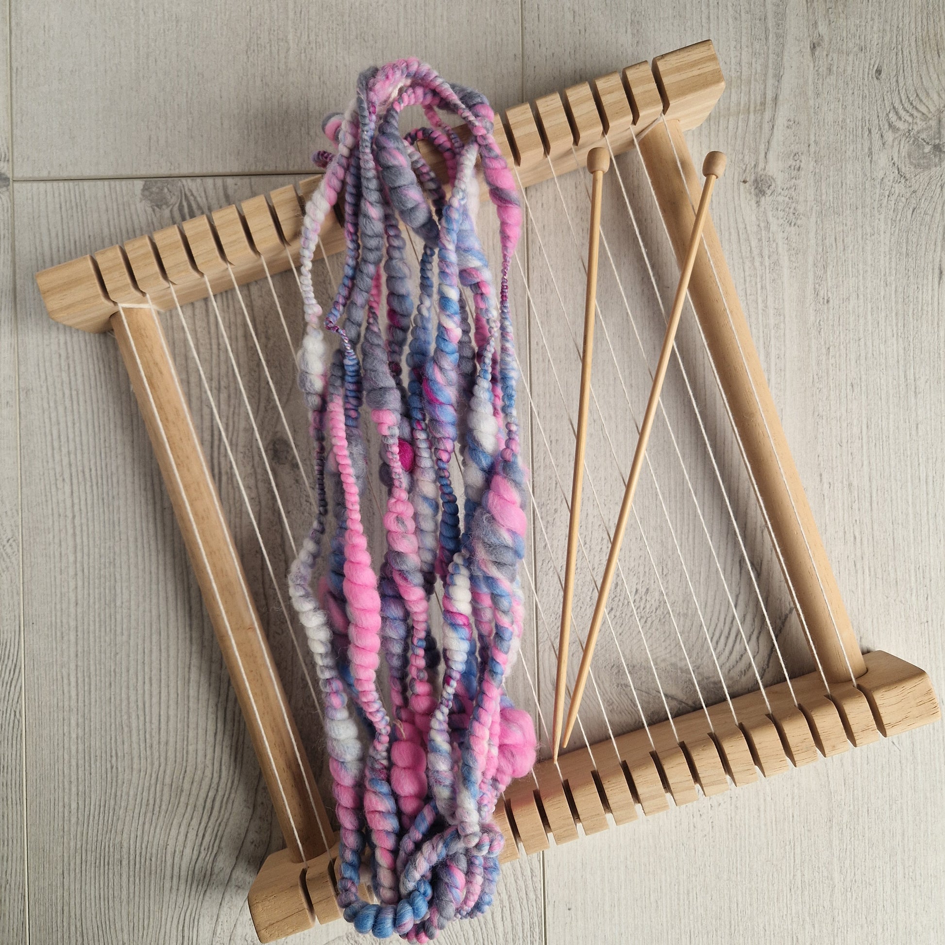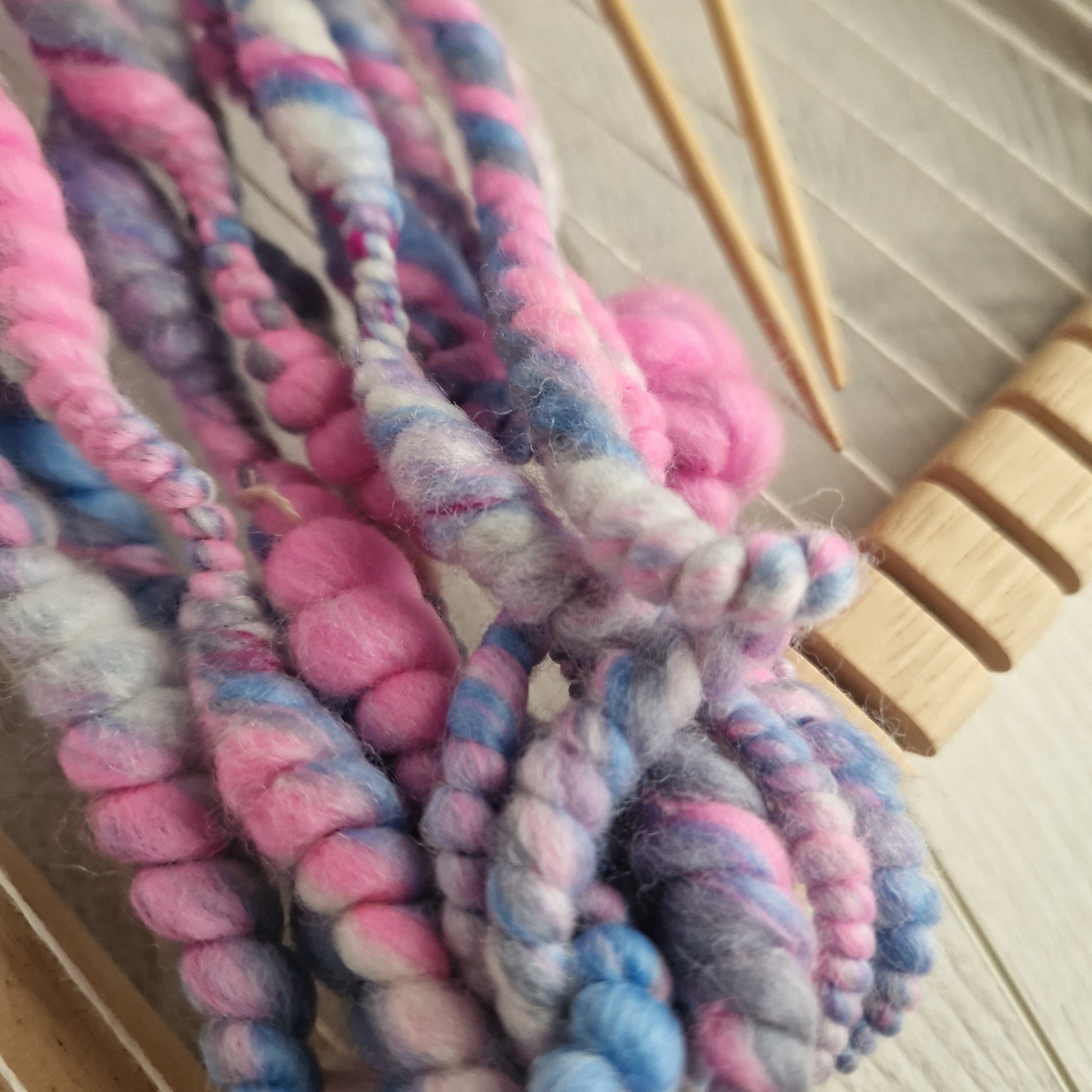 This bubble art yarn was handspun on an Ashford spinning wheel. Crafted from 100% merino wool, it features a blend of blue, pink, and white fibres, creating a unique textured coil yarn.