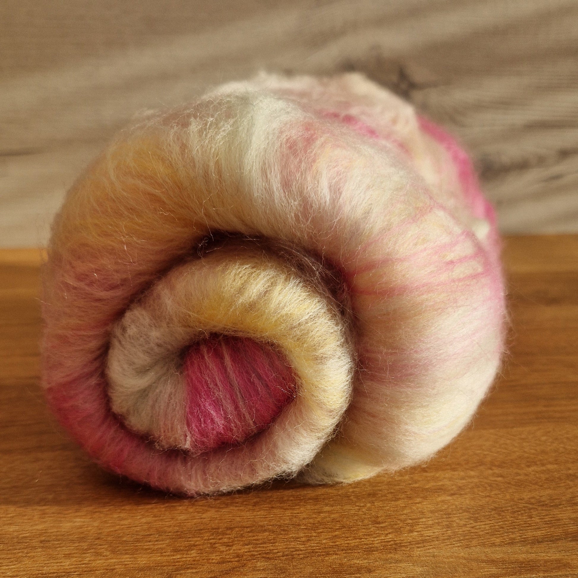 Pale pink and primrose yellow blend with cream in this Merino based batt. Sparkly silver Angelina fibres bringa bit of fun to the party! This batt weighs 95g.