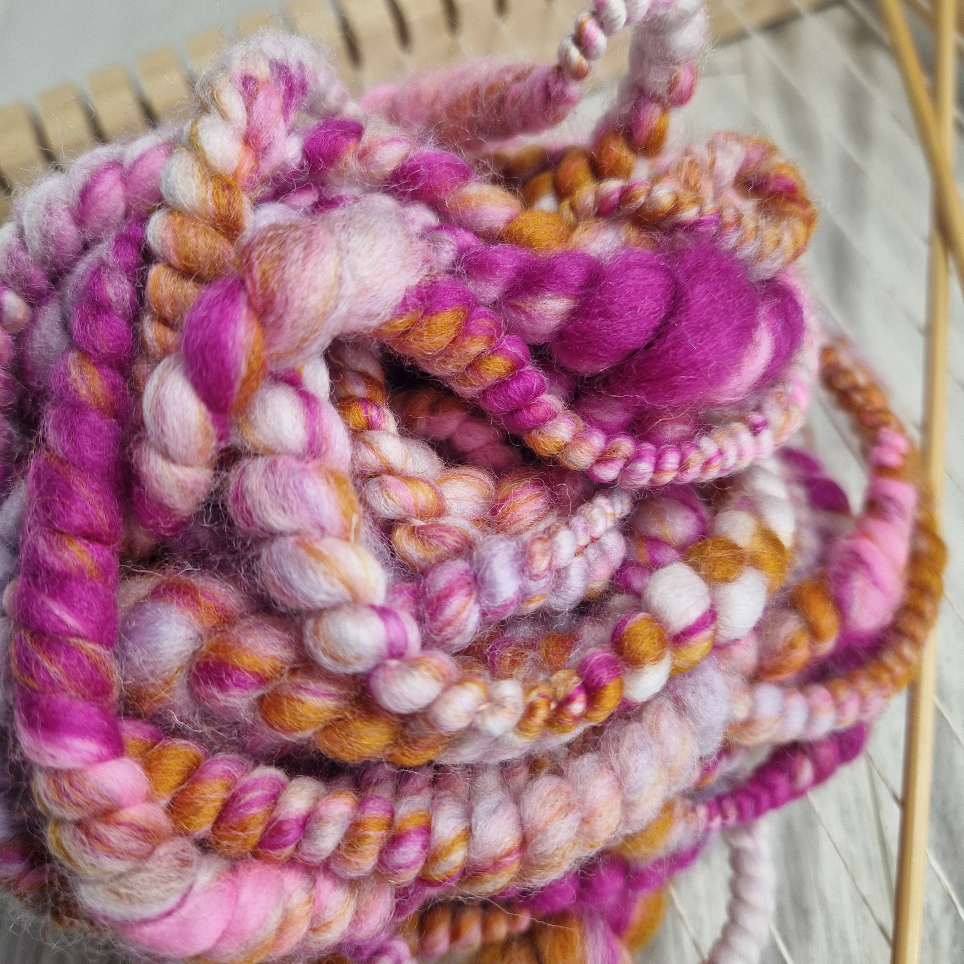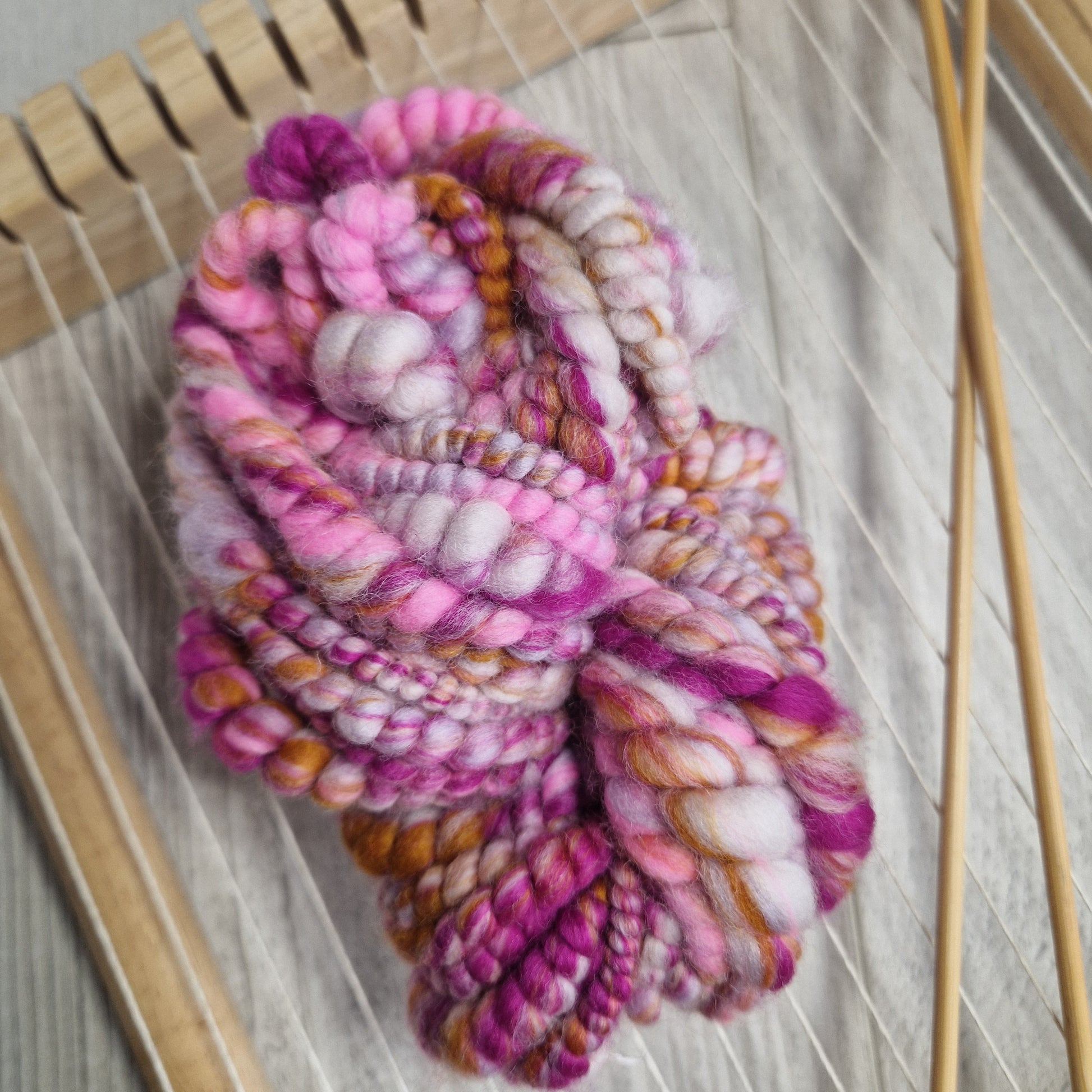 This bubble spun art yarn is 100% merino in shades of bright and deep pinks and cinnamon orange lightened with some white.