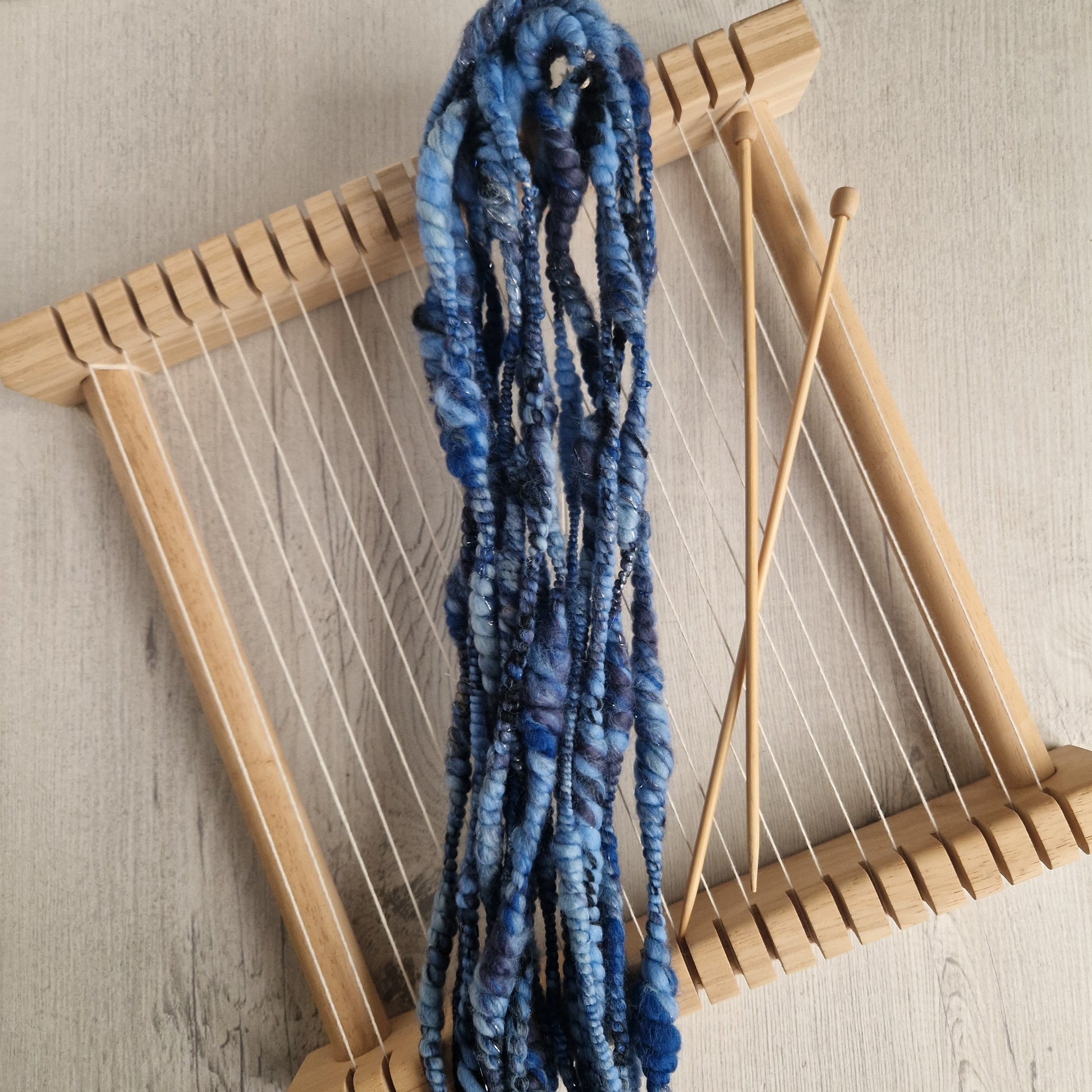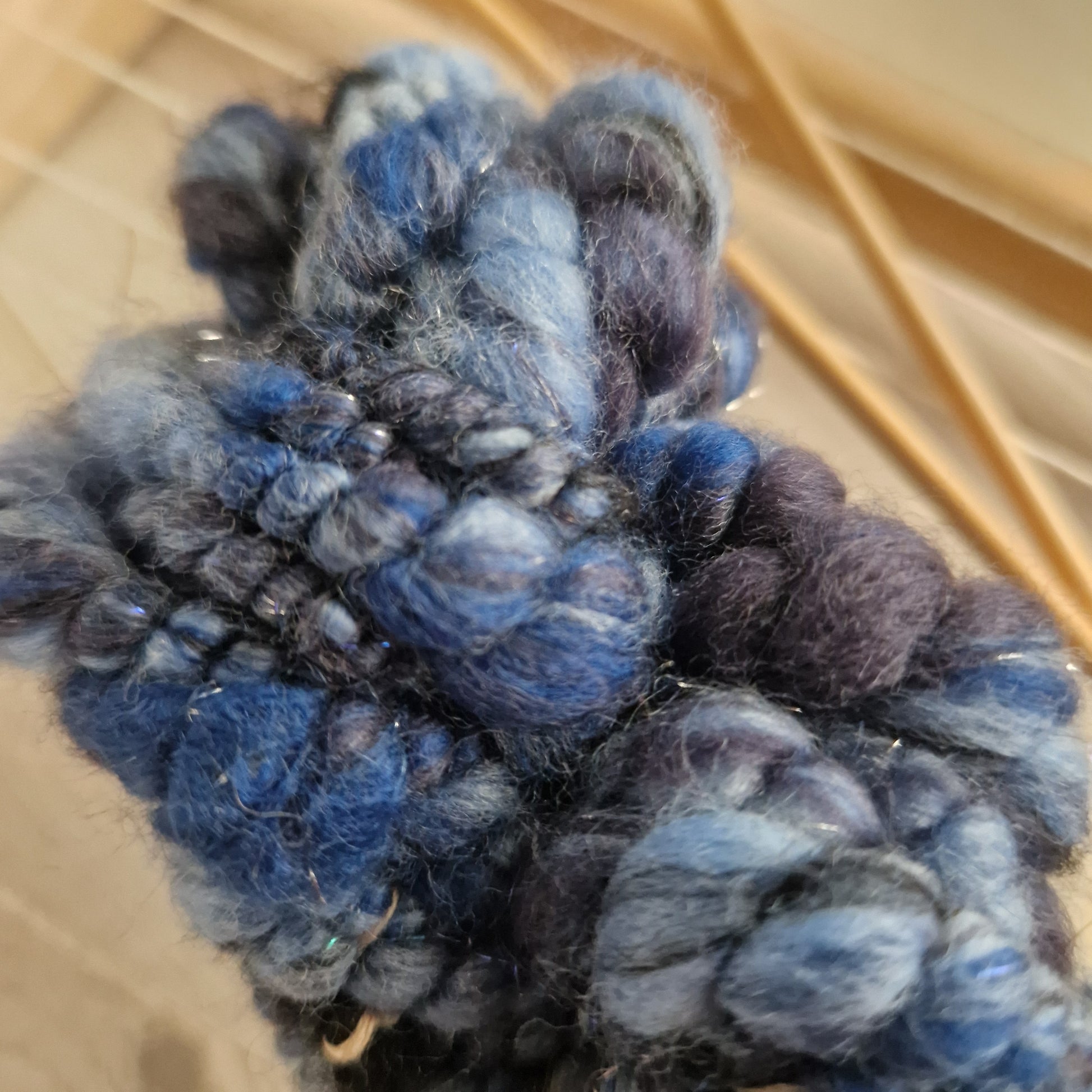 A coil spun yarn made of Merino fibres in shades of blue paired with blue and silver angelina fibres. This art yarn was spun using my Ashford spinning wheel and would be great in weavings and other textile projects!