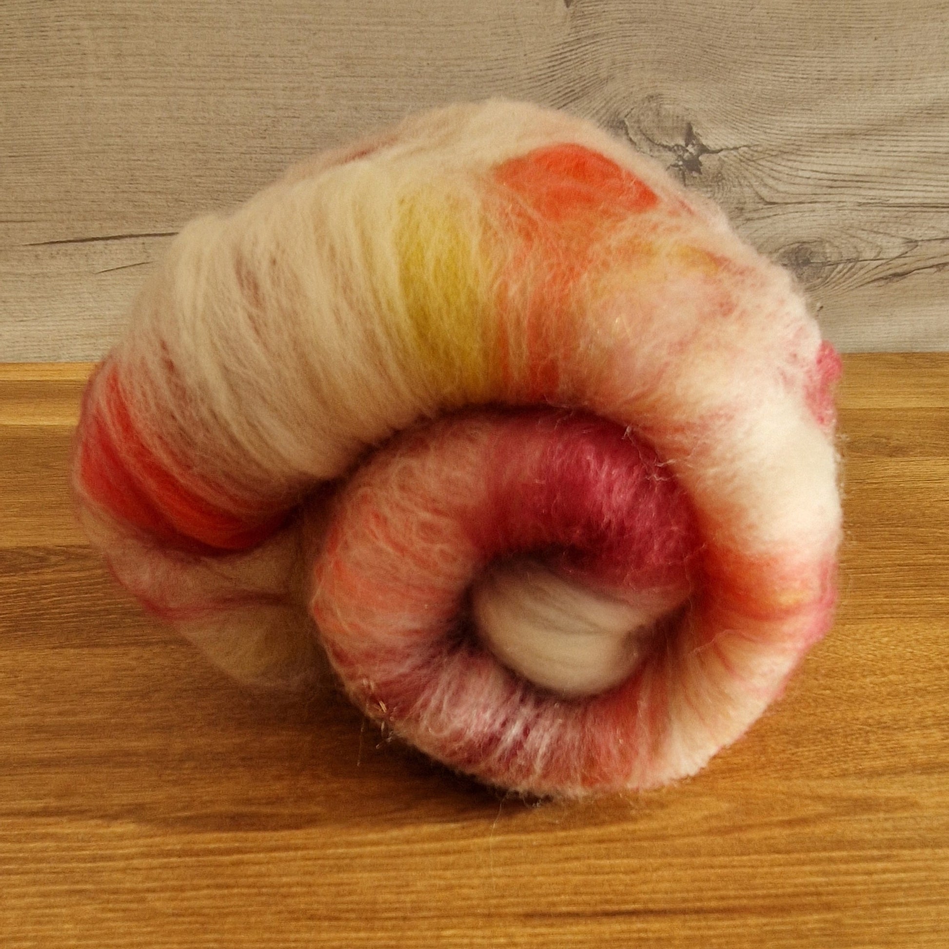 This carded fibre batt consists of Merino and English fibres in shades of cream, dark red, orange, rust and warm yellows. Gold Angelina fibres are layered in this batt which weighs 71g.